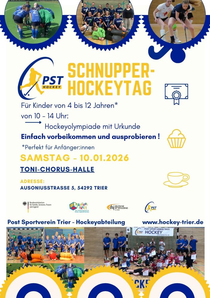 die Hockeyabteilung des Post-Sportvereins Trier lädt alle Trierer Kindergartenkinder, Schülerinnen und Schüler der 1. bis 6. Klassen ein, bei unserem Schnuppertag Hockey diesen tollen Sport einmal auszuprobieren. Es kann ein spezieller Hockey-Parcours des Deutschen Hockey-Bundes für Anfängerinnen und Anfänger absolviert oder Hockey einfach nur so spielerisch ausprobiert werden. Jede Teilnehmerin und jeder Teilnehmer erhält eine Urkunde, die Betreuung erfolgt durch unsere erfahrenen Trainerinnen und Trainer.
