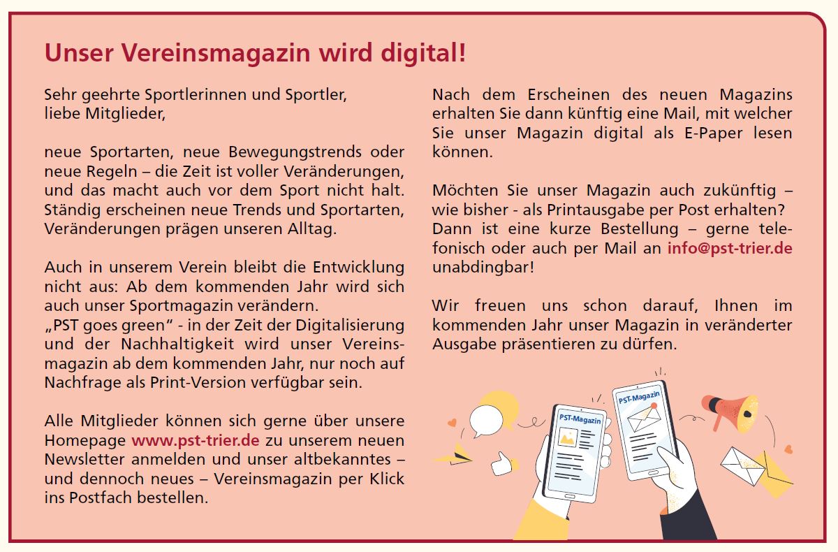 „PST goes green“ – in der Zeit der Digitalisierung und der Nachhaltigkeit wird unser Vereinsmagazin ab dem kommenden Jahr, nur noch auf